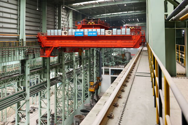 该产品采用四梁四轨双小车结构型式,主体结构在垂直及水平载荷作用下,具有很好的强度和刚度。大车车轮采用20轮布置方式,力学模型简单,轮压分布均衡,可有效降低厂房钢结构造价。