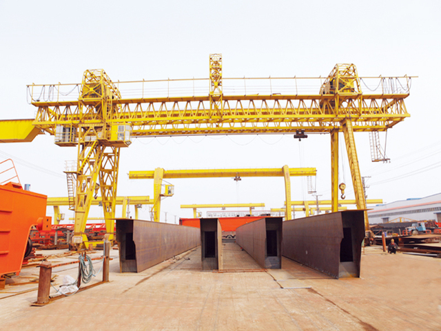 门架为桁架结构,具有结构轻、抗风力强等优点。包括主梁、上端梁、支腿、下端梁、走行台车及走台栏杆等。主梁采用三角桁架结构,上面铺设有轨道,供小车沿主梁方向作横向移动。支腿采用箱形或钢管两种形式。