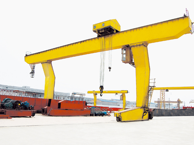 门架为箱形单主梁两支腿结构,起重量20t以下时小车采用垂直反滚轮式,大于20t时小车采用水平反滚轮式,在主梁一侧运行。主梁采用单梁偏轨形式,支腿与下横梁组成L型,支腿两侧一般均带有悬臂,吊运物品时过跨能力强,便于将物件从跨内转运到悬臂下。小车为侧面悬挂方式,吊具布置在主梁侧面,起重量≤20t时采用垂直反滚轮二支点形式,起重量>20t时采用水平反滚轮三支点形式。